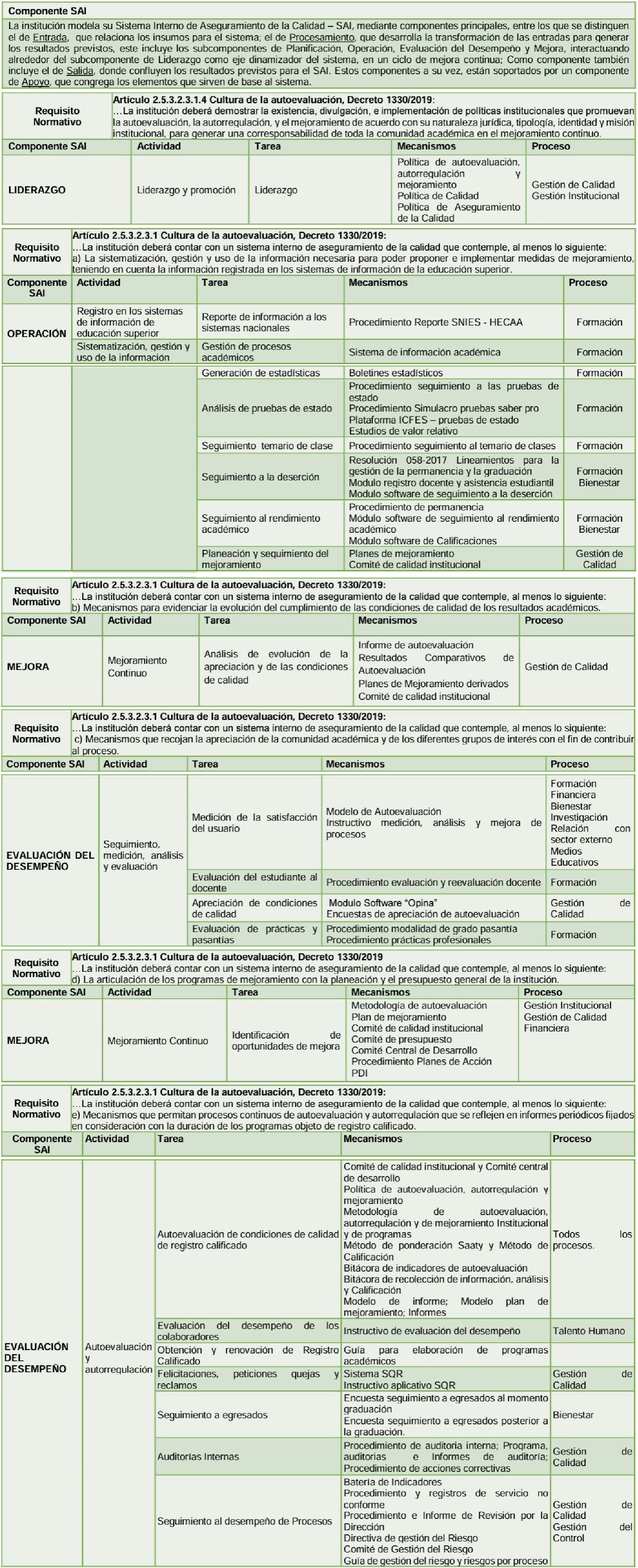 El Sistema de aseguramiento interno de la calidad de la Institución como se determina, responde desde sus componentes en todos los niveles al marco normativo del sector, como se detalla en las siguientes correlaciones: